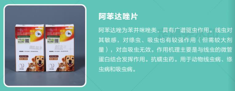 阿苯達唑為苯并咪唑類,具有廣譜驅蟲作用。線蟲對其敏感,對絳蟲、吸蟲也有較強作用(但需較大劑量),對血吸蟲無效。作用機理主要是與線蟲的微管蛋白結合發揮作用。抗蠕蟲藥。用于動物線蟲病、絳蟲病和吸蟲病。
