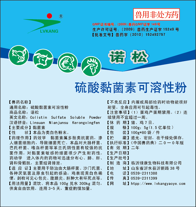 通用名稱:硫酸黏菌素可溶性粉商品名稱:諾松